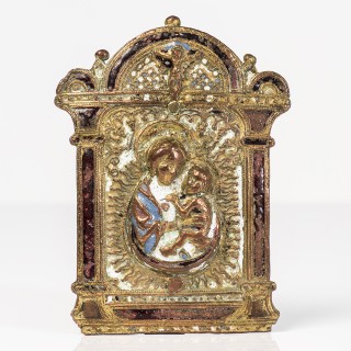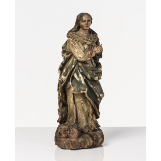 Vierge en bois sculpté en ronde-bosse polychromé et doré. Debout sur des nuées d'où sortent deux têtes d'angelots, les mains jointes...