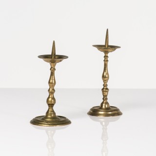 Deux petits pique-cierges en bronze, fût tourné en balustre, base circulaire moulurée, coupelle.XVII/XVIIIe siècle