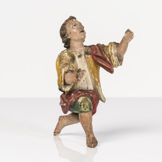 Enfant, personnage de crèche, en bois sculpté et polychromé, yeux en verre, un genou à terre, la tête levée vers le ciel. Italie du ...