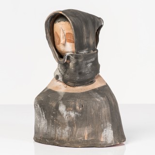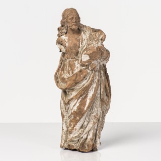 Saint Joseph en terre cuite avec restes de monochromie blanche. Debout, tenant l'Enfant sur le côté gauche, il est vêtu d'une tuniqu...