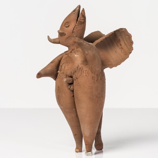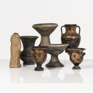 Trois cratères, deux coupes sur pied, un vase, une Tanagra sans têteTerre cuite