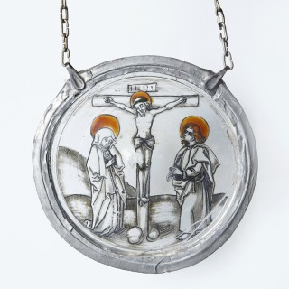 Petit rondel, «cul de bouteille», représentantla Crucifiion entre la Vierge et saint Jean en