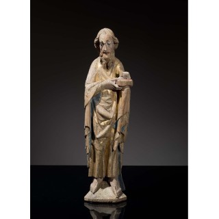 Saint Jean-Baptiste en noyer sculpté en ronde-bosse. Debout, il est vêtu de la mélote ; longue chevelure tombant sur les épaules, be...