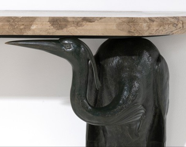 The console "Aux hérons" is a perfect illustration of this. The elegant herons in patinated bronze that adorn this piece symbolize grace and freedom. The choice of the bird, often associated with the tranquility of marshes and still waters, reflects Cheuret's attention to animals in motion, captured in both realistic and stylized poses. Here, the herons seem frozen in time, suspended between strength and delicacy.