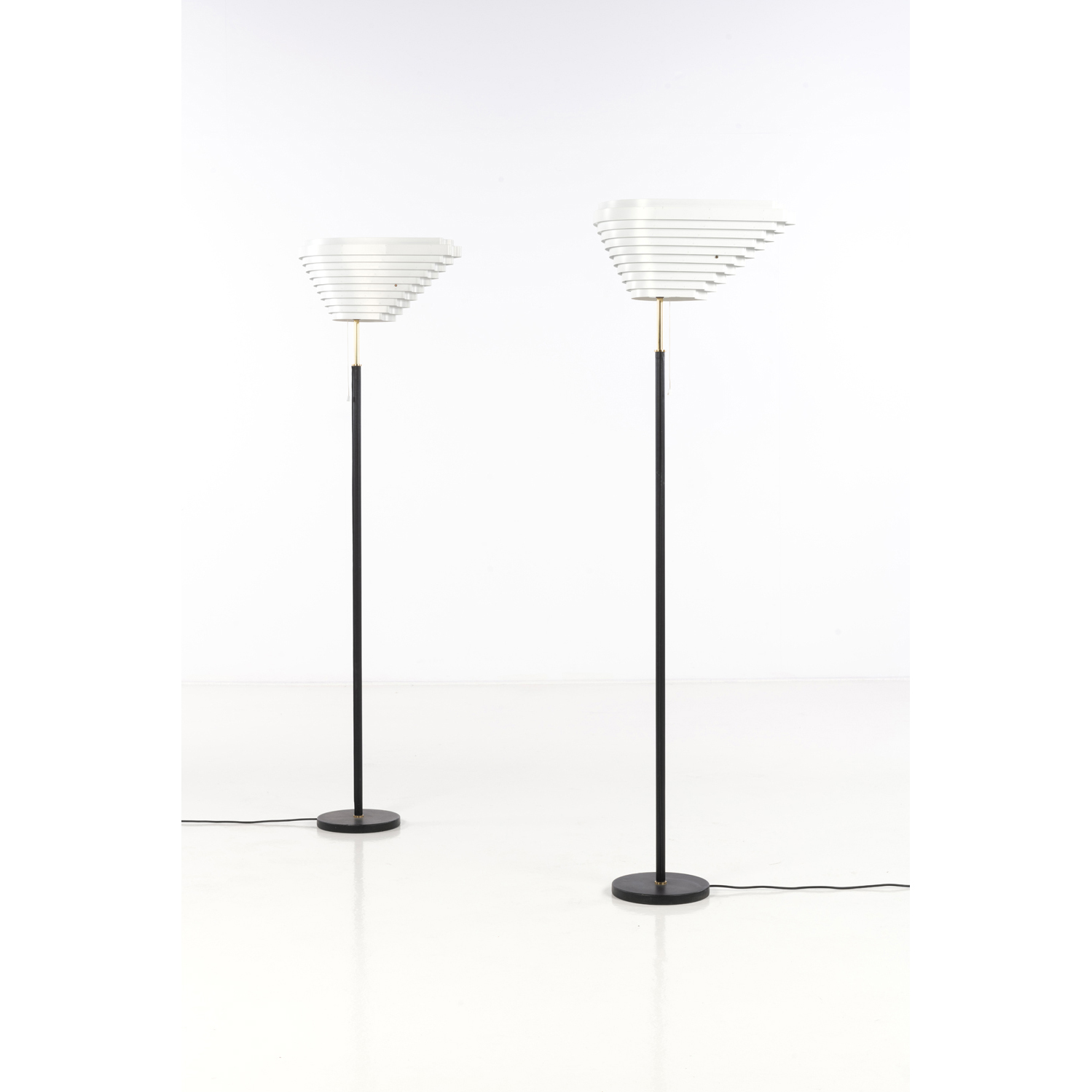 But Alvar Aalto is also known for its large production of lighting fixtures (wall lights, hanging fixtures, lamps, etc.). Made of brass, leather and lacquered metal, the pair of "Model A 805" street lamps were published around 1970 by Valaisinpaja. It is easy to see the attention that the architect paid during his career to the geometry of forms in space.
