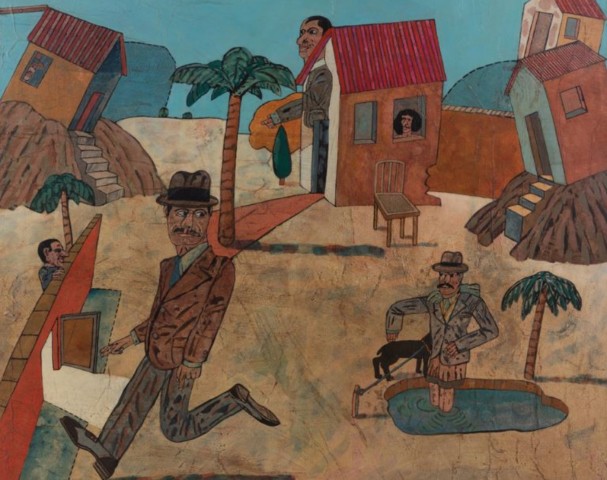 Seguí became famous with his urban landscapes where the characters, mostly male and preferably headstrong, never cease to run amidst colourful dwellings and public gardens that cohabit without any relation of scale. This teeming agitation, expressed in a primitive voluntary style, arouses amusement and questioning. But behind the seemingly sympathetic, even naive atmosphere of these paintings lies the artist's critical and acerbic vision: "Segui's work," writes Daniel Abadie, "is in reality a trapped work. Presenting itself with the greatest simplicity, imbued with a lightness that seems to be corroborated by its obvious humour, it appears at first glance as an elegiac image, an ironic and distant commentary on the world when it is in fact a moral reflection, a lesson in learning to see.