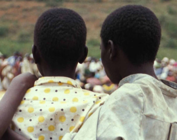 In the video Embrace, two young boys hold one another tightly, both as a sign of friendship and for mutual support in the face of a scene, concealed from the viewer’s gaze by the children’s back. While the image may seem innocuous at first glance, the body language suggests pain, solidarity, and love, feelings that the Chilean artist Alfredo Jaar argues were absent from the international community’s response to the rwandan tragedy.