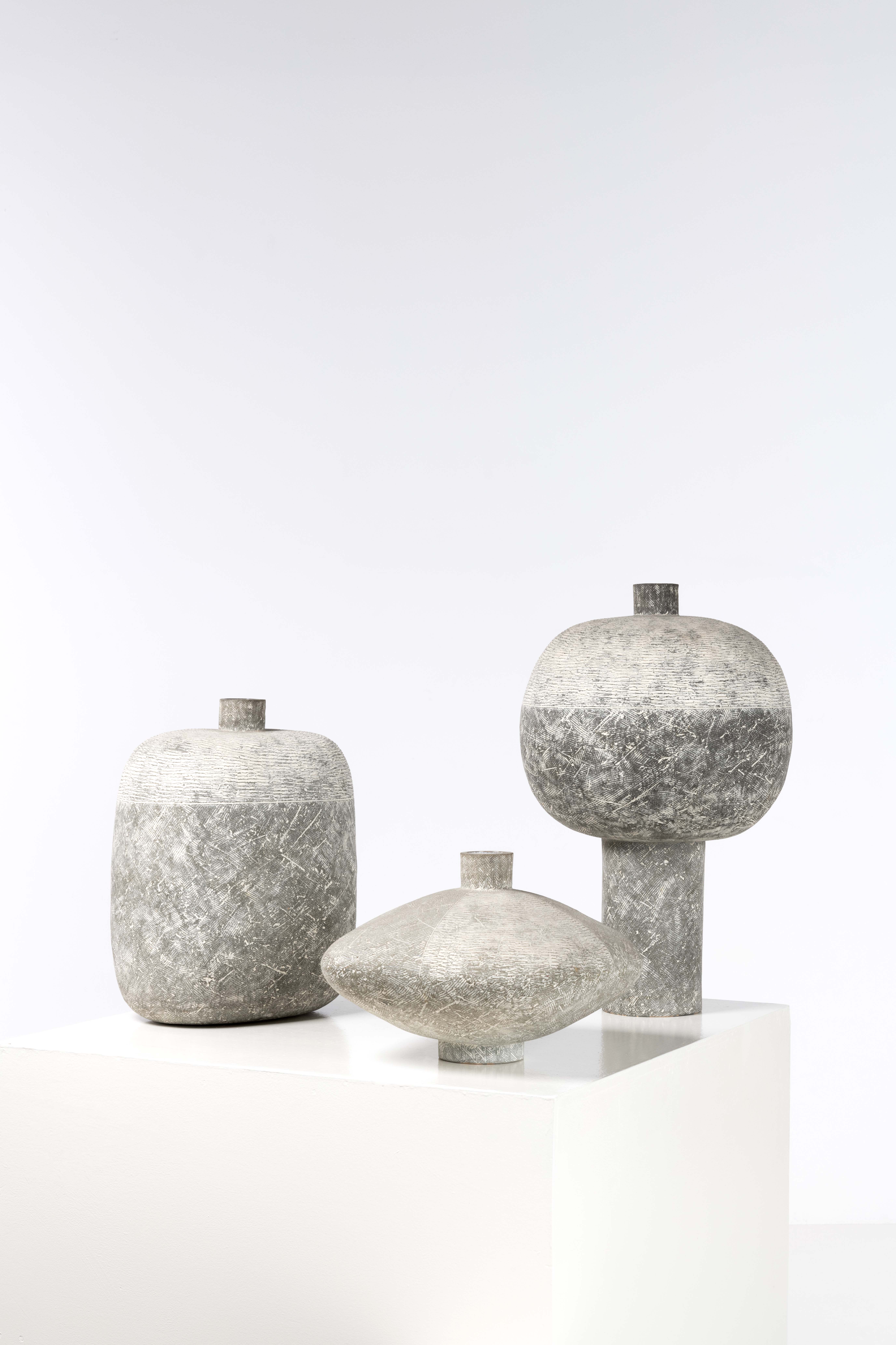 Throughout his prolific career, Claude Conover produced only ten series of trio artworks. Most of these sets were not made available to the public but were exclusively offered to his top clients and close friends. The artist believed these groups represented the ultimate expression of his life's work. Each trio features matching glazes and decorations. Our piece is the very first trio ever commercialized, and it is highly unlikely that another complete set will appear on the market due to their rarity. This group was also featured in the artist's vintage advertisements, a photograph of which we reproduce here.
