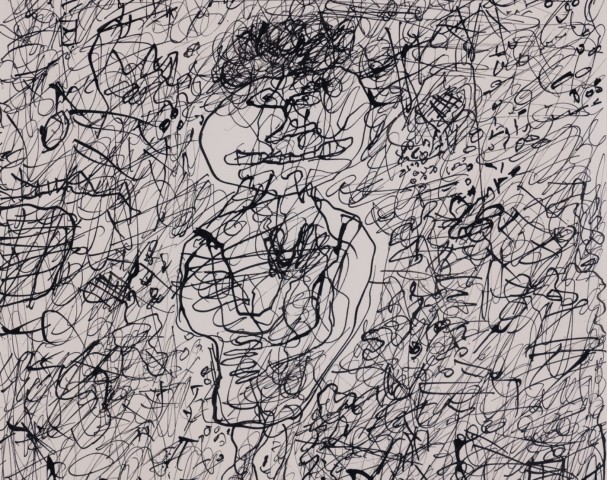 In this work, the silhouette of a man emerges with difficulty from a landscape made by energetic strokes of Indian ink. Visual translation of the artist's commitment to a culture that he later defines as asphyxiant, the schematic character is a point of passage to the still intact imagination of childhood. Overloaded and even saturated, the surface of this drawing is not unlike those of the series Materialologies and Texturologies realized during the previous decade.
