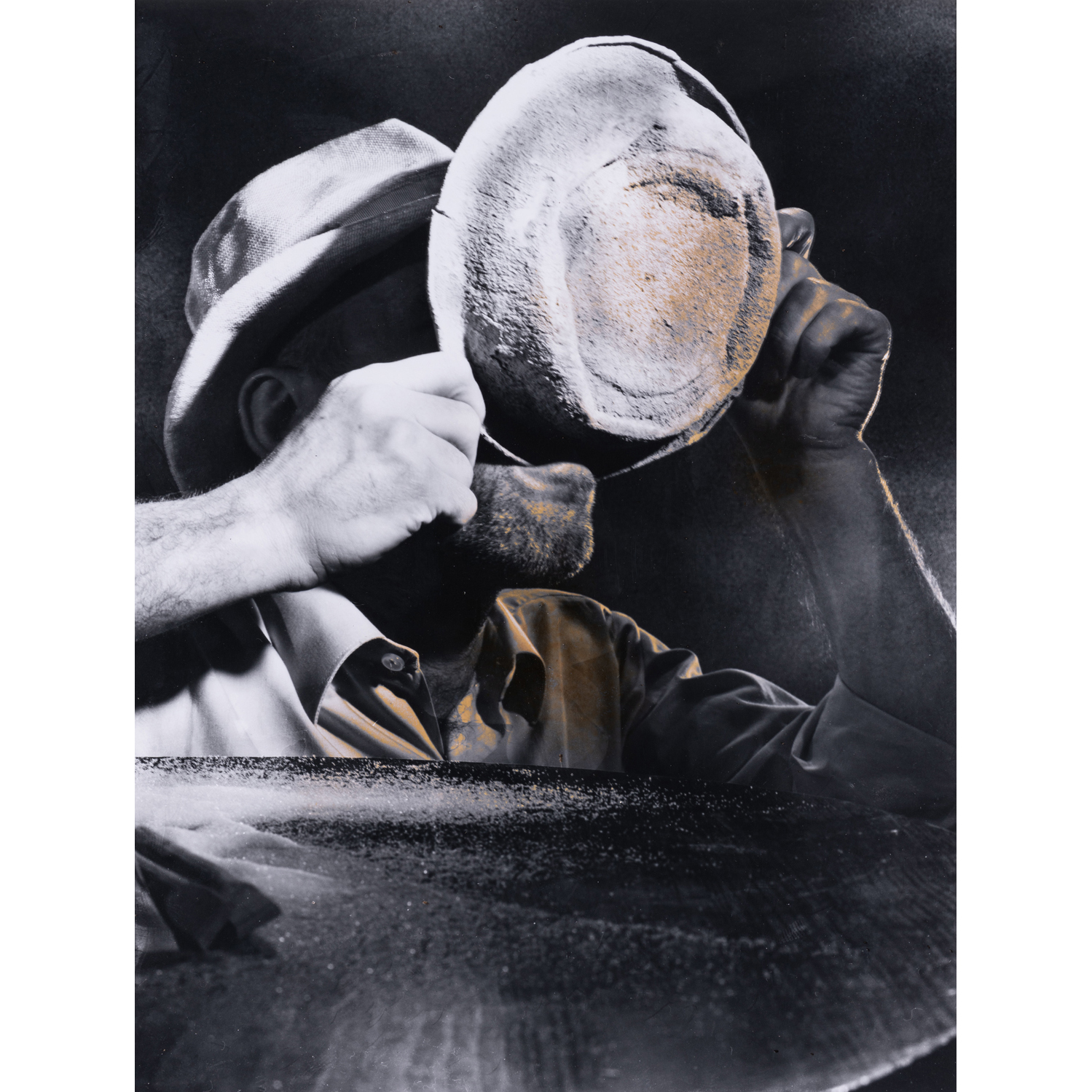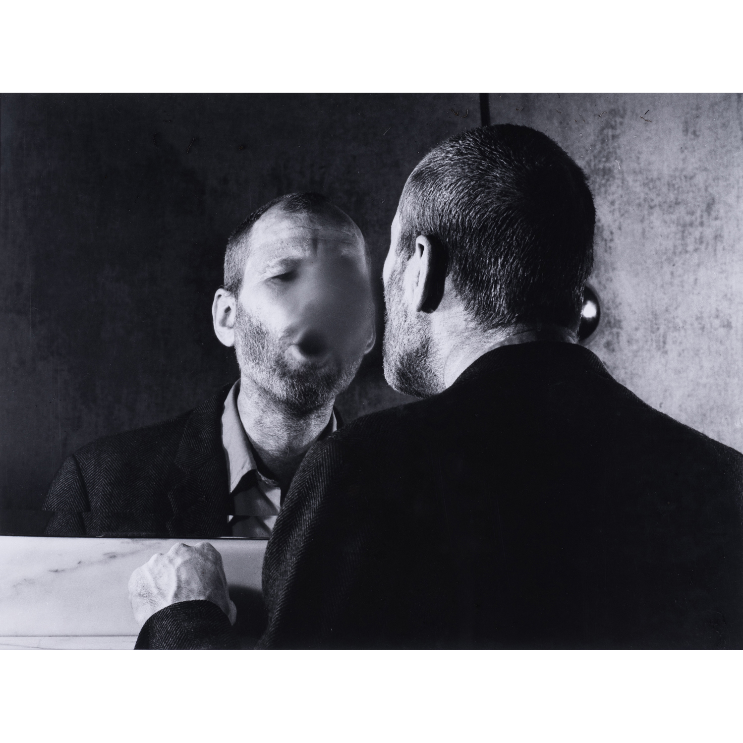 The interposition of his body between the photographic lens taking the place of the seer and the image produced (his in the mirror) reminds us that the essence is not comparable to the representation. A real beat occurs between reality and imitation, visual value and tactile value. The vapor covering the mirror seems to correspond to a symbolism of erasure.