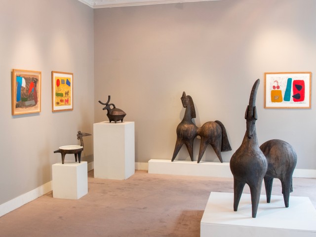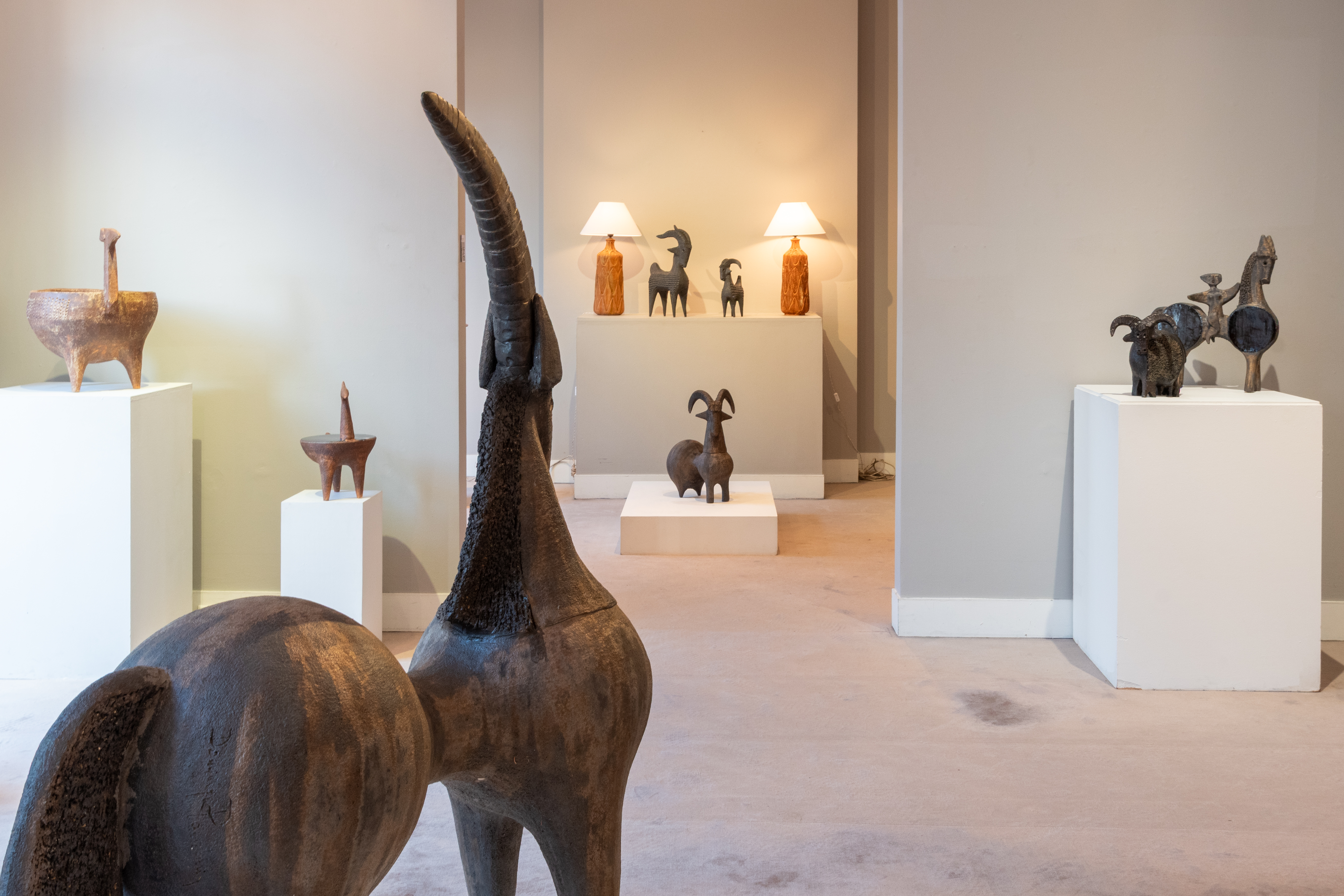 The sale gathers forty key works from his vocabulary — from monumental animal sculptures to console-sculptures combining ceramics and wood, and functional pieces (lamps, wall works), along with a selection of bronzes and preparatory drawings.