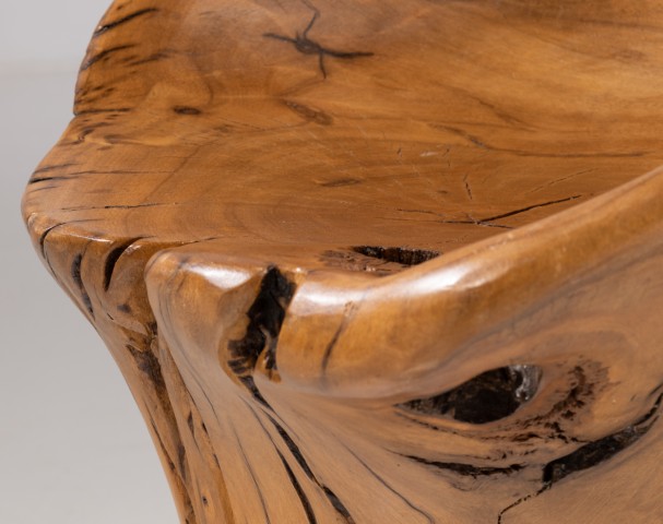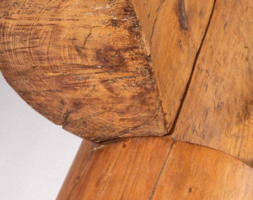 His creation is born from a creative dialogue with the raw material. The shapes, cracks, wear of time on the wood are the basis of each work. The species chosen are those usually abandoned by traditional carpentry; all parts of the tree are used: roots pulled out of the ground, hollow trunks, monumental logs. The size of the pieces often requires the works to be shaped on site, highlighting the shapes and textures of the wood.