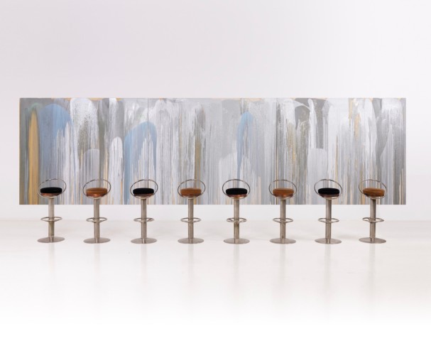 The monumental installation that PIASA auction house offers for sale was realized in 2008. In front of a triptych six meters wide covered with oil paint and glitter, eight stools stand vertically. Estimated between 60,000 and 80,000 euros, the work is characteristic of the motley creation of an artist seeking more to surprise than seduce.