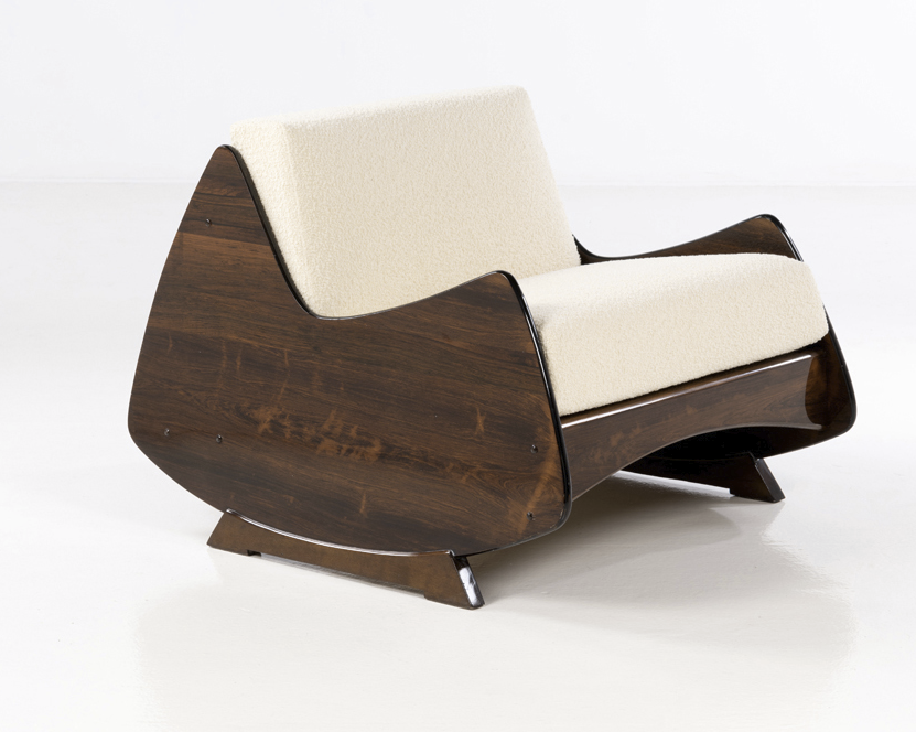 The other piece by Jorge Zalszupin is a "Poltrona Ameba" armchair. The chromatic range of the imbuia veneer contrasts harmoniously with the beige of the textile. Also published by the Atelier Moveis, it is estimated at between 8,000 and 12,000 euros.