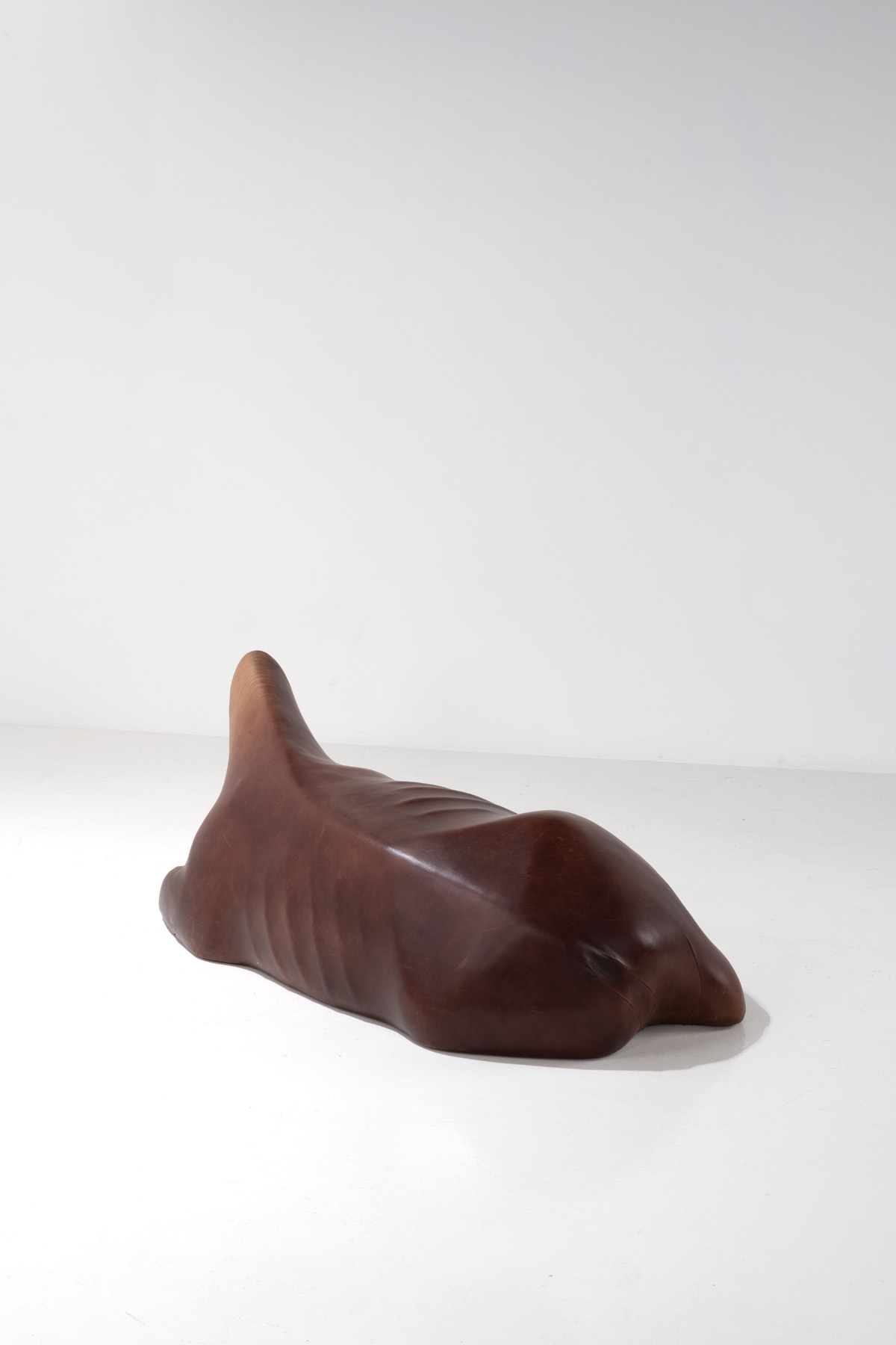In the world of design, some objects simply occupy space. Others disrupt it. Julia Lohmann’s Cow Bench (2005, €8,000 / €12,000) clearly belongs to the latter category: a leather bench that, beneath its sagging silhouette, evokes less a piece of furniture than an animal. In this case, a cow lying down, headless. Julia Lohmann chooses to restore to the material its lost animality. The piece, produced in thirty editions, presents itself as a walking paradox, a functional piece of furniture on which one quickly no longer feels much desire to sit. Beneath the stretched hide, the designer sculpted a foam form that hints at ribs, a spine, muscles. Nothing deeply anatomical—simply the suggestion of a body.