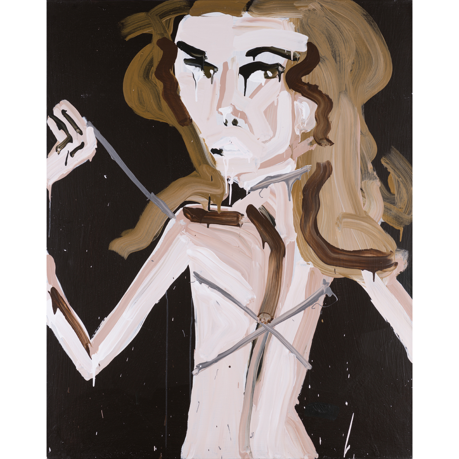 Katherine Bernhardt is a contemporary American artist. Known for her style characterised by rapid brushstrokes, fluid gestures and shimmering colours, her preferred medium is painting. In the early 2000s, she attracted the attention of the art world with her paintings of female models, works through which she questions the fashion industry and the notion of beauty. The work shown here was part of the solo exhibition Katherine Bernhardt - Kiss me Kate, at Gallery LOYAL, Stockholm in 2007, which brought together a series of portraits of Kate Moss inspired by multiple advertisements collected by the artist from fashion magazines. Subsequently, Katherine Bernhardt turned to the representation of everyday objects taken out of their context, which she throws pell-mell onto the canvas, giving her creations an eccentric and disordered dimension. Inspired by oriental carpet prints, African textiles and tropical imagery, Katherine Bernhardt's work is a mixture of influences from around the world, which she draws from her extensive travels.