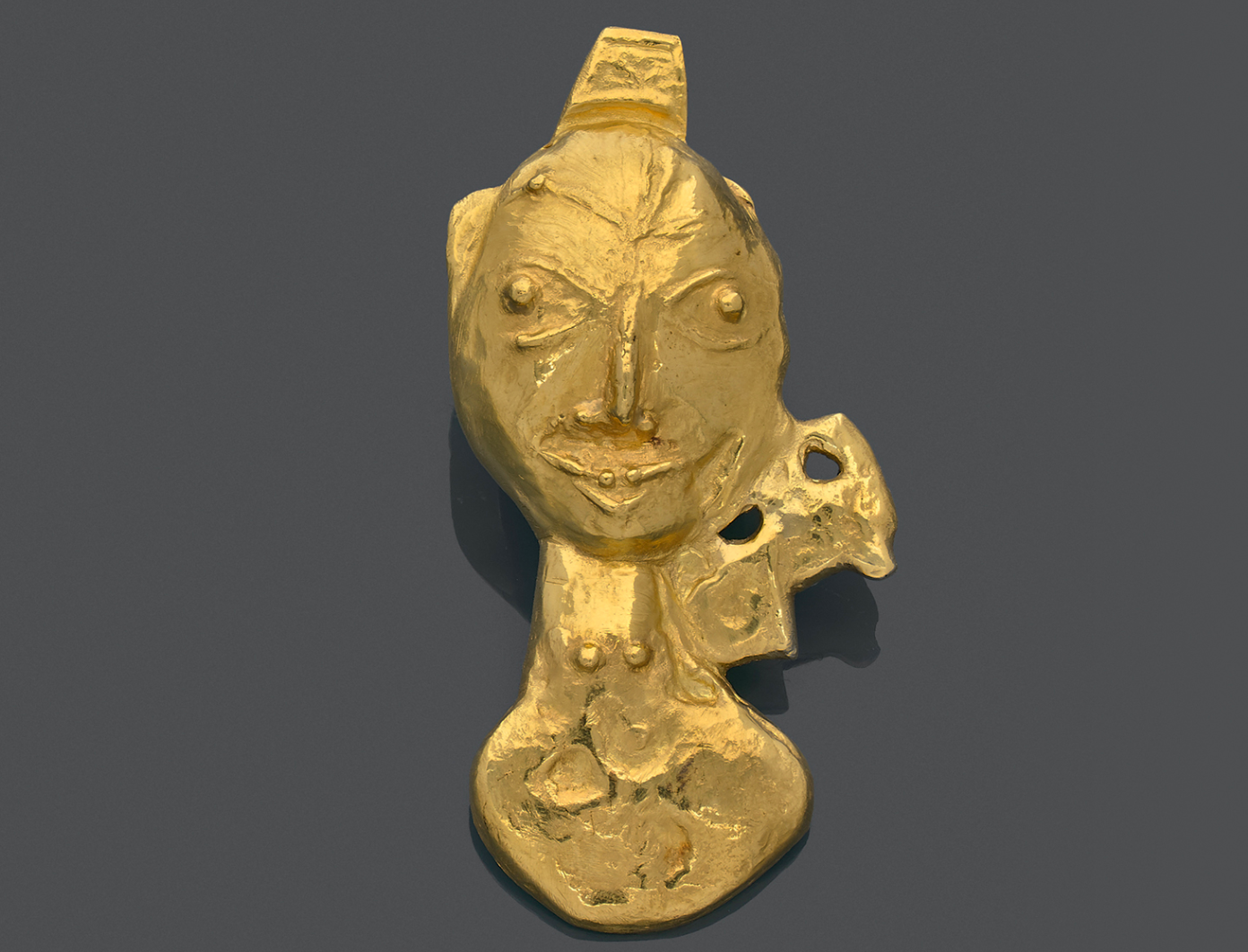 The so-called "Cretan" pendant offered for sale by PIASA is estimated at between 12,000 and 18,000 euros. It is presented in its original box. Made with lost wax, this 23 carat yellow gold object represents a character. His eyes as exorbited eyes take a very important place.