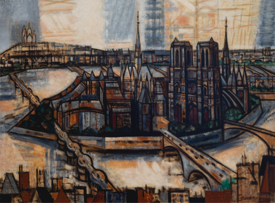 Dame de Paris, while in the distance emerges the Sacred Heart. It is estimated at between 30 000 and 50 000 euros. The style of Gromaire perfectly marries the monumentality of Gothic art. Under his brush, the Cathedral is restored in all its grandeur: the artist has favoured a view of its façade, and in the background we can see the pointed arches and other elements of its architecture (spires, transept, rosettes...).