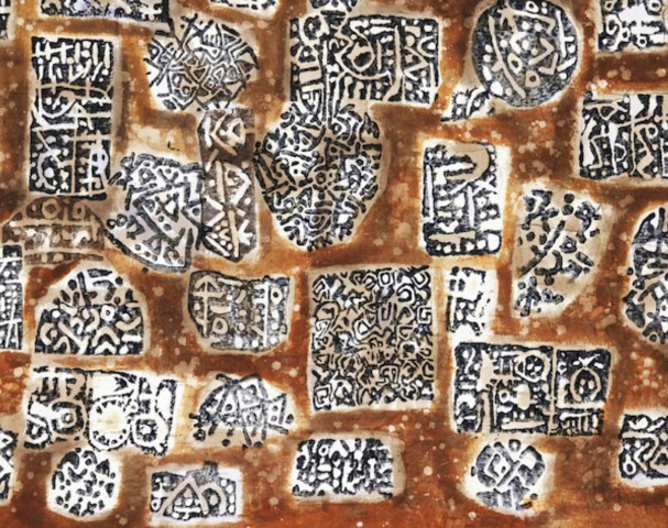 On his return to Syria, the artist researched the traditional folk art of his country and reinvested the millennial heritage of Syrian textile production. Using cut-out and engraved plates, he prints multiple small cells of complex designs on cotton, creating mixed works recalling both Bedouin textile motifs, abstract expressionism or even ancient hieroglyphics.