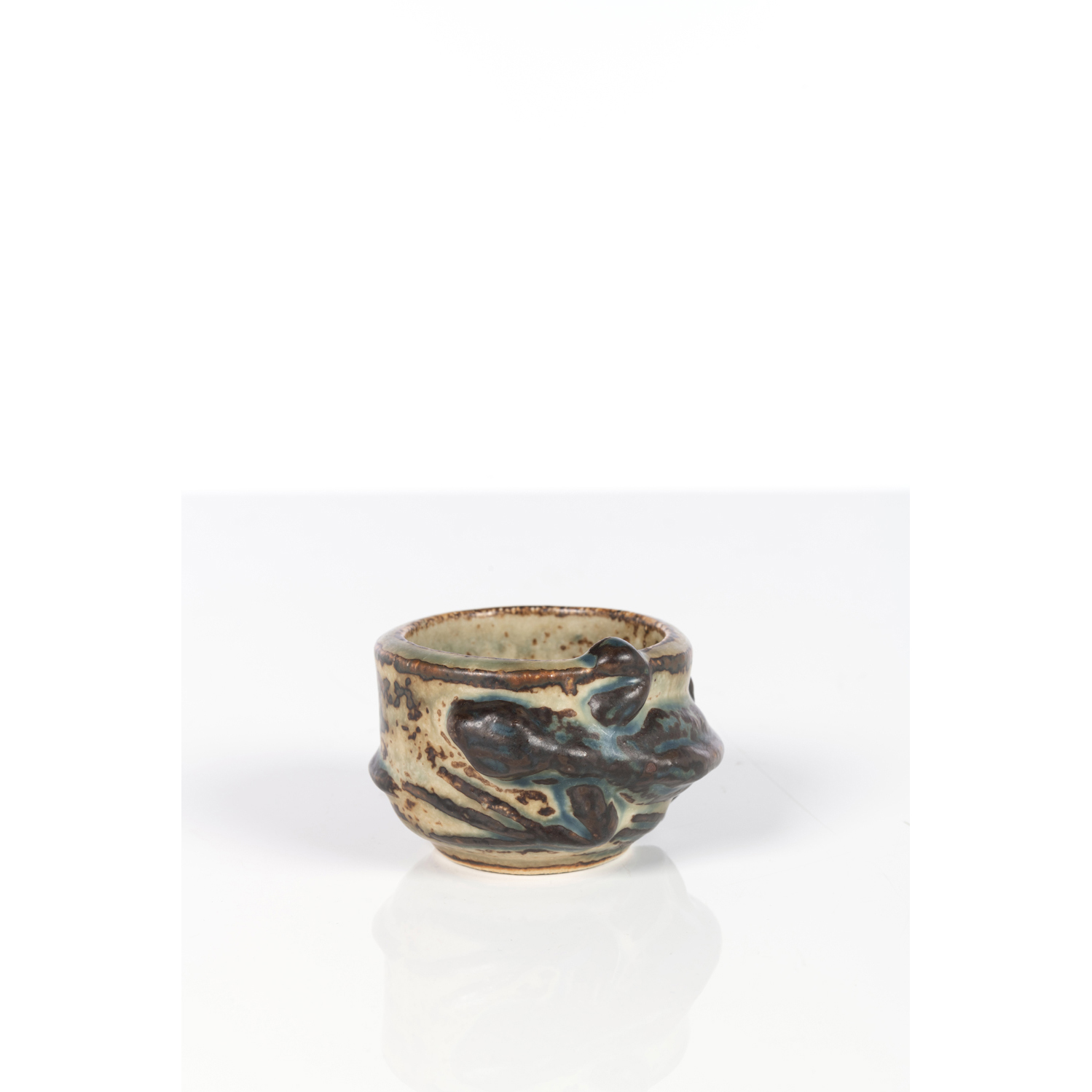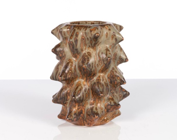 It was in 1925 at the Universal Exhibition in Paris that Axel Salto demonstrated his talent in the field of ceramics with his first works in porcelain, enamels on biscuit, executed by the Danish manufacturer Bing & Grøndahl. In the field of stoneware, Salto began modestly, in a small establishment where all the details of the execution could be closely followed and controlled and, with Carl Halier, a skilled ceramist, he managed to possess perfect material and technique. Later, under more favourable conditions, he collaborated with the ceramist Nathalie Krebs. From 1933 onwards, he had all his works executed by the Royal Manufacture of Copenhagen, thus having at his disposal the technical resources of a large factory. The artist shows a real gift for observing nature from which he draws to imagine his new sandstone creations. After the "fluted" style based on simple repetitive zigzag patterns comes the "button" or "bud" style, inspired by chestnuts and eucalyptus fruits.