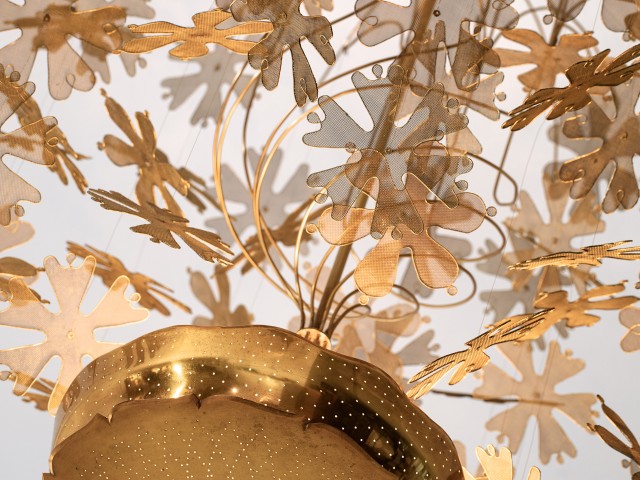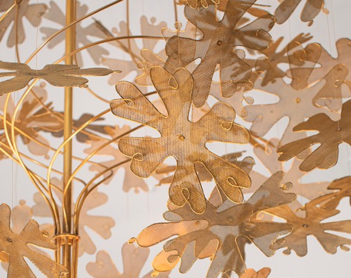 Its construction, relatively simple, is based on a bowl holding the light source and a rod supporting a set of arms from which decorative metal mesh elements, reminiscent of snowflakes, are suspended. The upward projection of light passes through the snowflakes, which come to life and shimmer in silence, creating a rare, poetic dance of projected shadows. Beginning in 1950, Paavo Tynell set out to conquer the American market, opening Finland House in New York, which for several years showcased the best of his work in a multi-level space dedicated entirely to promoting Finnish culture.