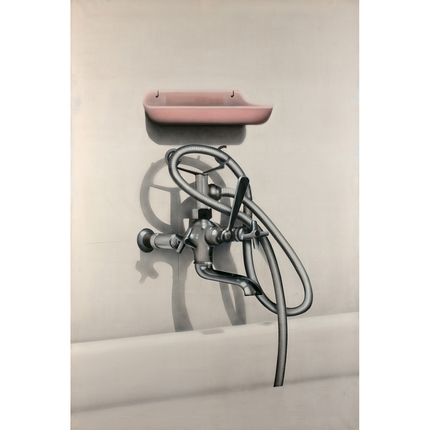 In conflict with modernity, frightened by the deployment of technical gigantism, Peter Klasen denounced the excesses of consumer society by making everyday objects, whether utilitarian or mechanical, cohabit with fragments of the human body in his paintings: this was the period of the binary paintings. They were presented at the artist's first institutional exhibition, entitled "Ensembles and Accessories", held at the ARC (Musée d'Art Moderne de la Ville de Paris), curated by Suzanne Pagé and Pierre Gaudibert. Peter Klasen showed an installation on the theme of the body and sanitary facilities, with surgical utensils, bidets, pipes, certain objects enhanced with neon, and paintings representing bathtubs and toilets on a real scale. Our painting, Salle de bain (1972), which is stylistically very radical, is in line with these works: its subject is the representation of an ordinary object, in this case a tap, which occupies the entire canvas and stands out against a neutral background.