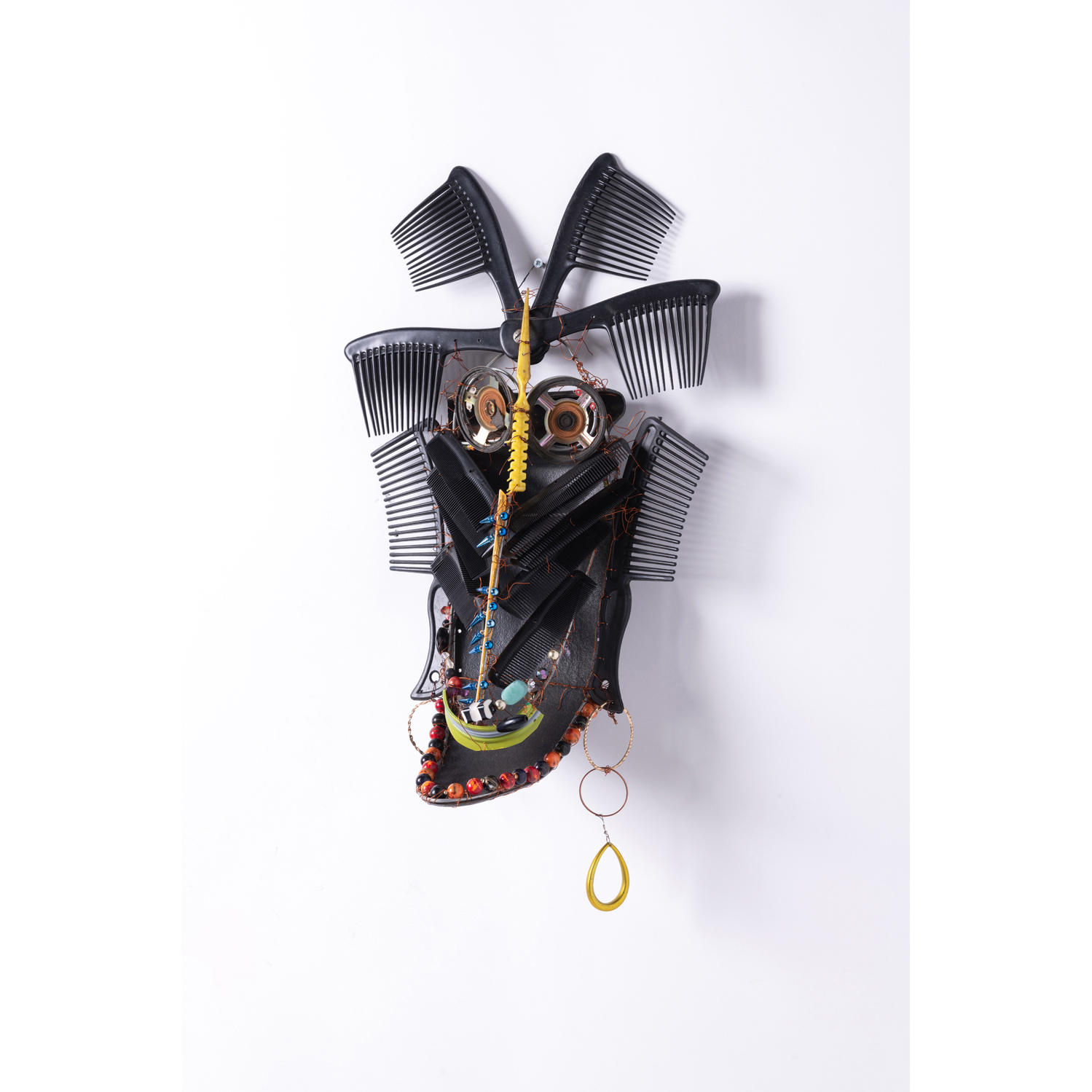 Calixte Dakpogan est né à Pahou, au Bénin. Il vit et travaille actuellement à Porto-Novo. Entouré d’une famille de forgerons et habitant un district de PortoNovo dédié à Ogun, dieu du fer, c’est avec son frère qu’il commence à créer des masques en récupérant la tôle des voitures et les déchets abondants des rues. Ses masques, anthropomorphes ou zoomorphes sont agrémentés de petits objets de consommation, comme des tongs, des bouteilles en verre, des cassettes ou des cadenas. L’œuvre présentée ici rend hommage aux soins apportés aux cheveux et à la coiffure en Afrique et sont une réflexion sur les babioles bon marché importées de Chine, comme les peignes, les bijoux et les décorations de Noël. Depuis 1990, ses œuvres ont été exposées à travers le monde, et dernièrement à la Fondation Louis Vuitton lors de l’exposition collective “Art/Afrique : le nouvel atelier”, en 2017. «Toutes mes sculptures parlent autant de mon pays le Bénin, ma culture, mon environnement, mes croyances que de ma vision du monde».