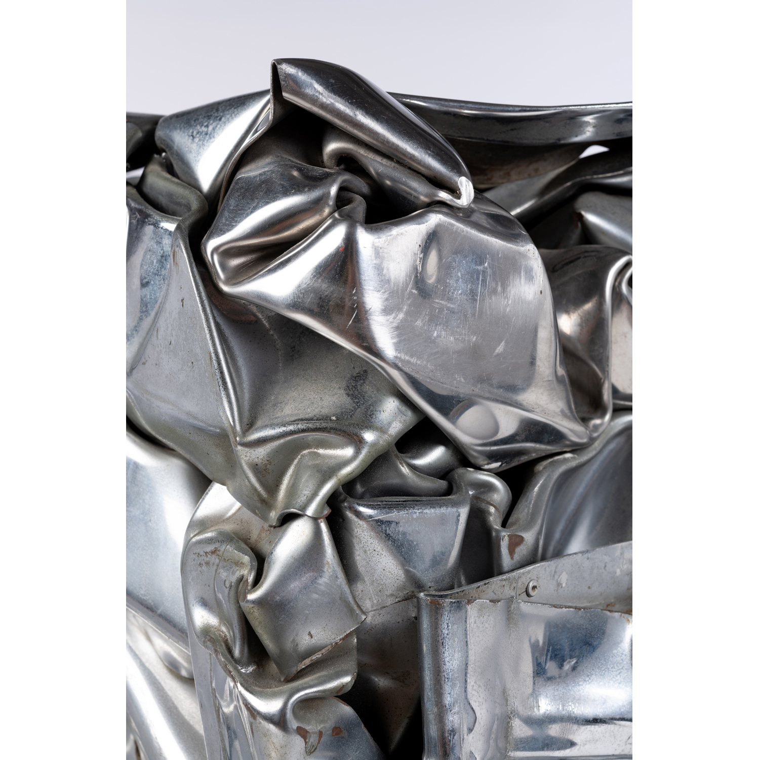 Caesar's famous series of "Compressions" was initiated in 1960 after he accidentally discovered a giant American hydraulic press in a scrap yard in Gennevilliers that could swallow up the size of a car. After these "Compressions" of the beginnings, described as "raw", Caesar made "Directed Compressions" whose elements he chose according to their intrinsic properties. As shown in our Bumper Compression (1960), the shapes are intertwined with a strong desire for composition, in order to determine a parallelepipedic block in their stacking. The degree of compression of the shapes has been designed to enhance the reflective quality of the bumper metal. When Caesar presented his first "Compressions" at the 16th Salon de Mai in 1960, the public screamed in scandal. More knowledgeable, art critic Pierre Restany saw a decisive break in the history of sculpture, evoking "a new stage of metal", subjected to "a quintessential reduction".
