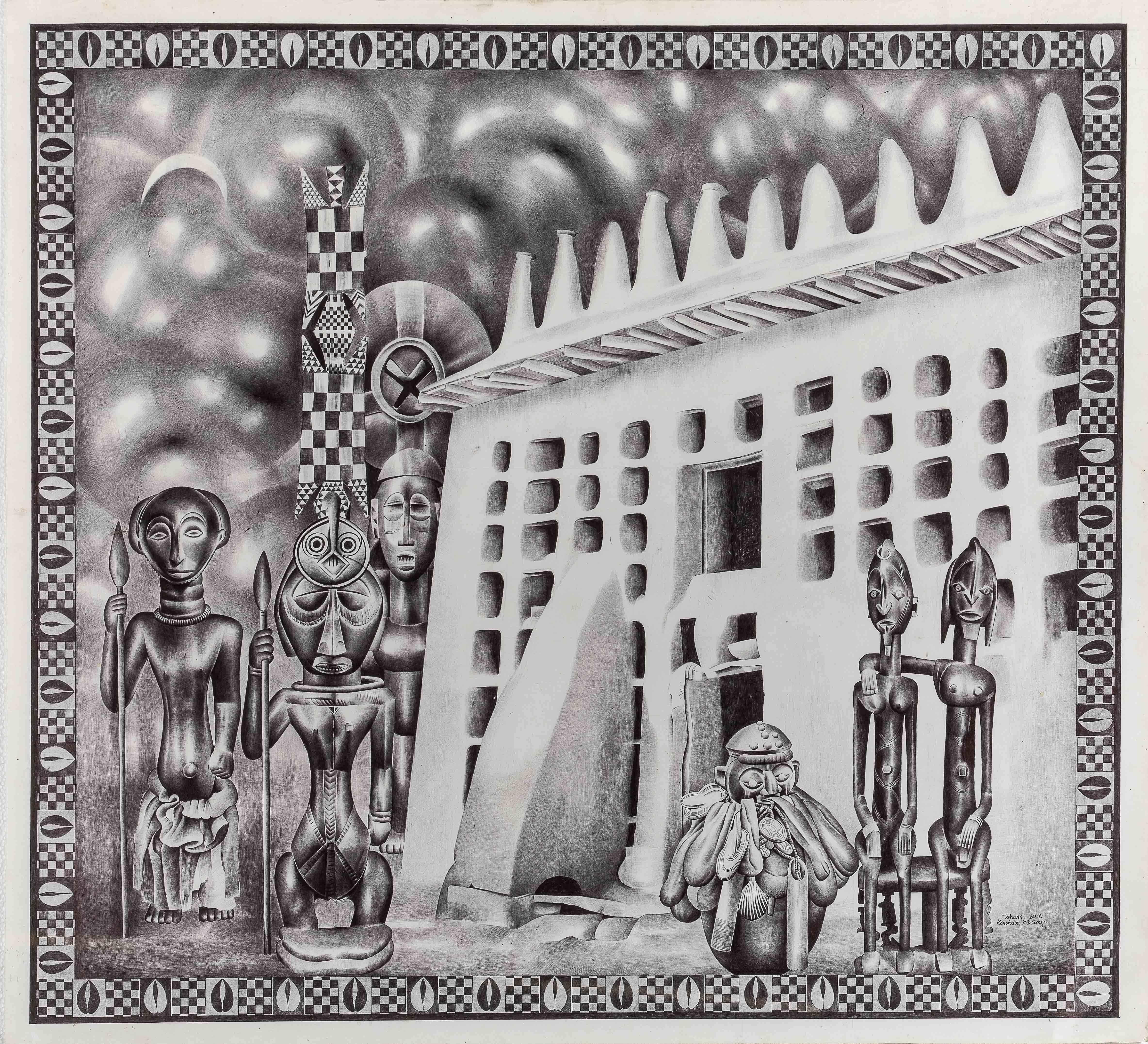 Raymond Tsham Mateng was born in 1963 in Lubunz, in the Kasai Oriental (DRC). He lives in Kinshasa. Tsham draws almost exclusively with a ballpoint pen masks and statuettes from Congo and elsewhere with infinite precision. He poses as an ambassador of the early arts, and looks with great sympathy and gratitude at the approach of Matisse, Picasso or Brancusi who were inspired by primitive African art.