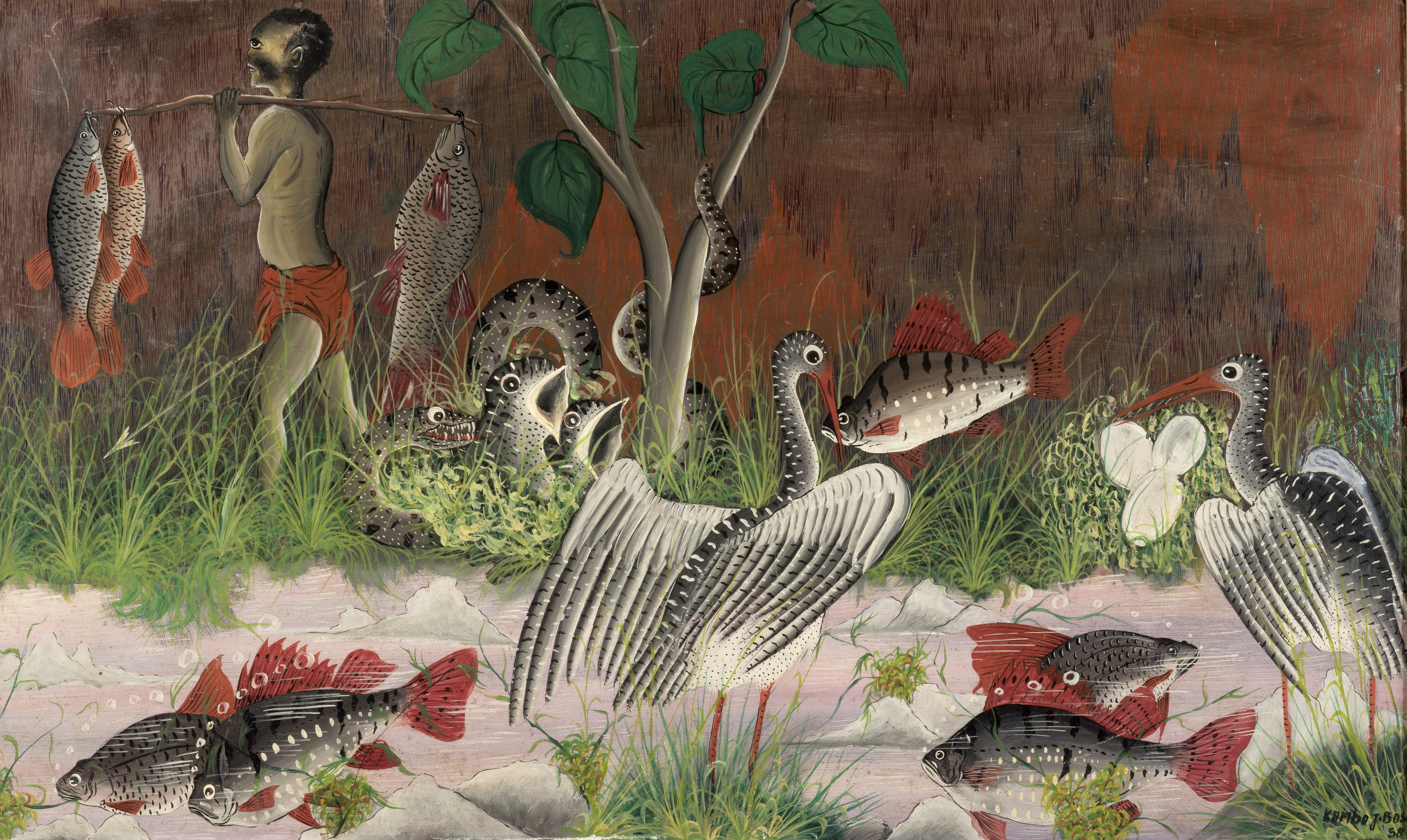 Jean-Bosco Kamba is trained at the Elisabethville Fine Arts Academy. His depiction of nature is rich in colors and details. Perhaps one of painters the most faithful to reality, Kamba's works are very much like Japanese prints with a surrealist dimension.