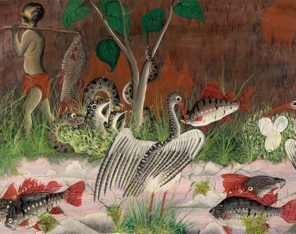 With a total lack of perspective, on a flat landscape, disproportionate nestlings, endless reptiles and fishes in the midst of clouds evolve in the indifference of the fisherman.