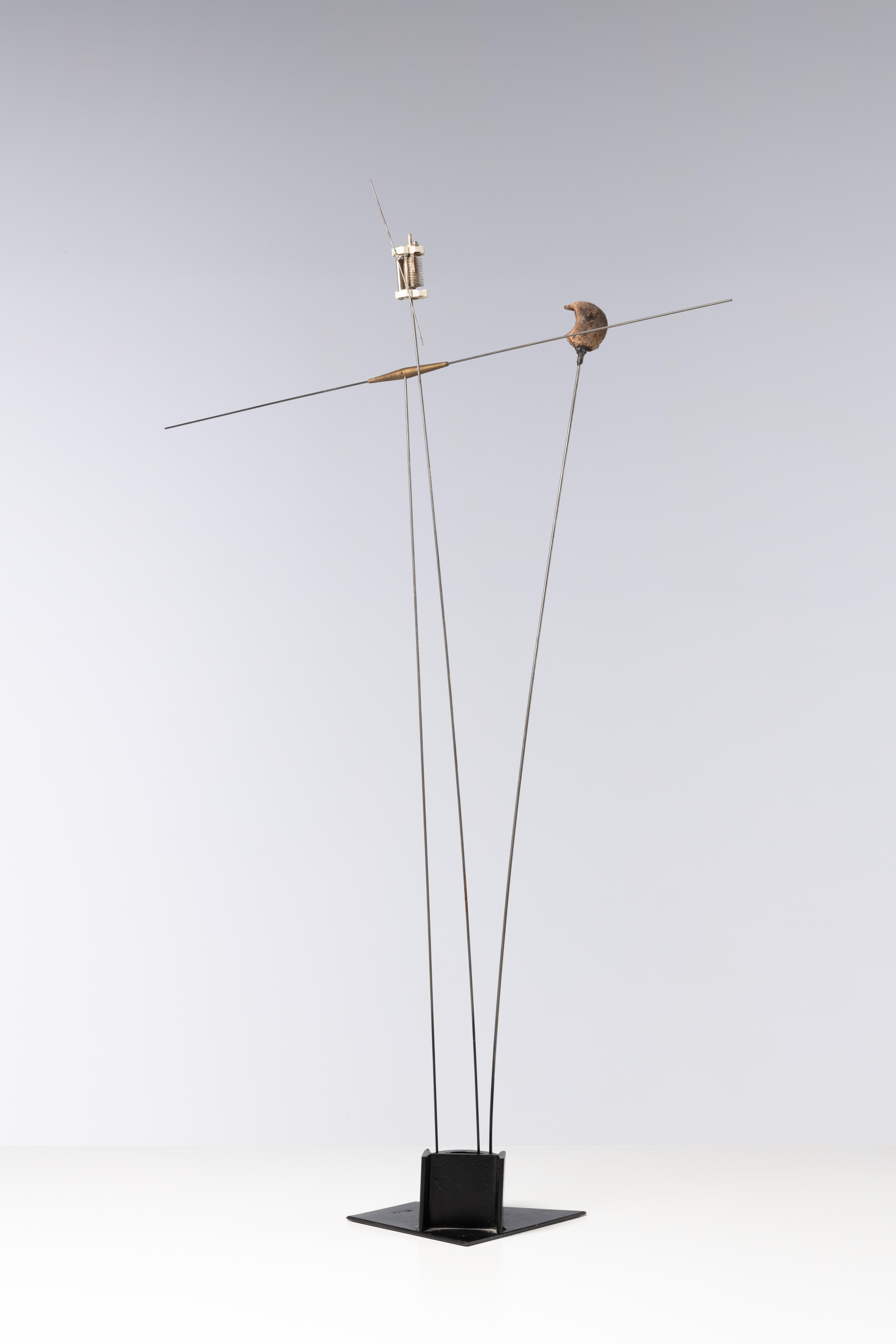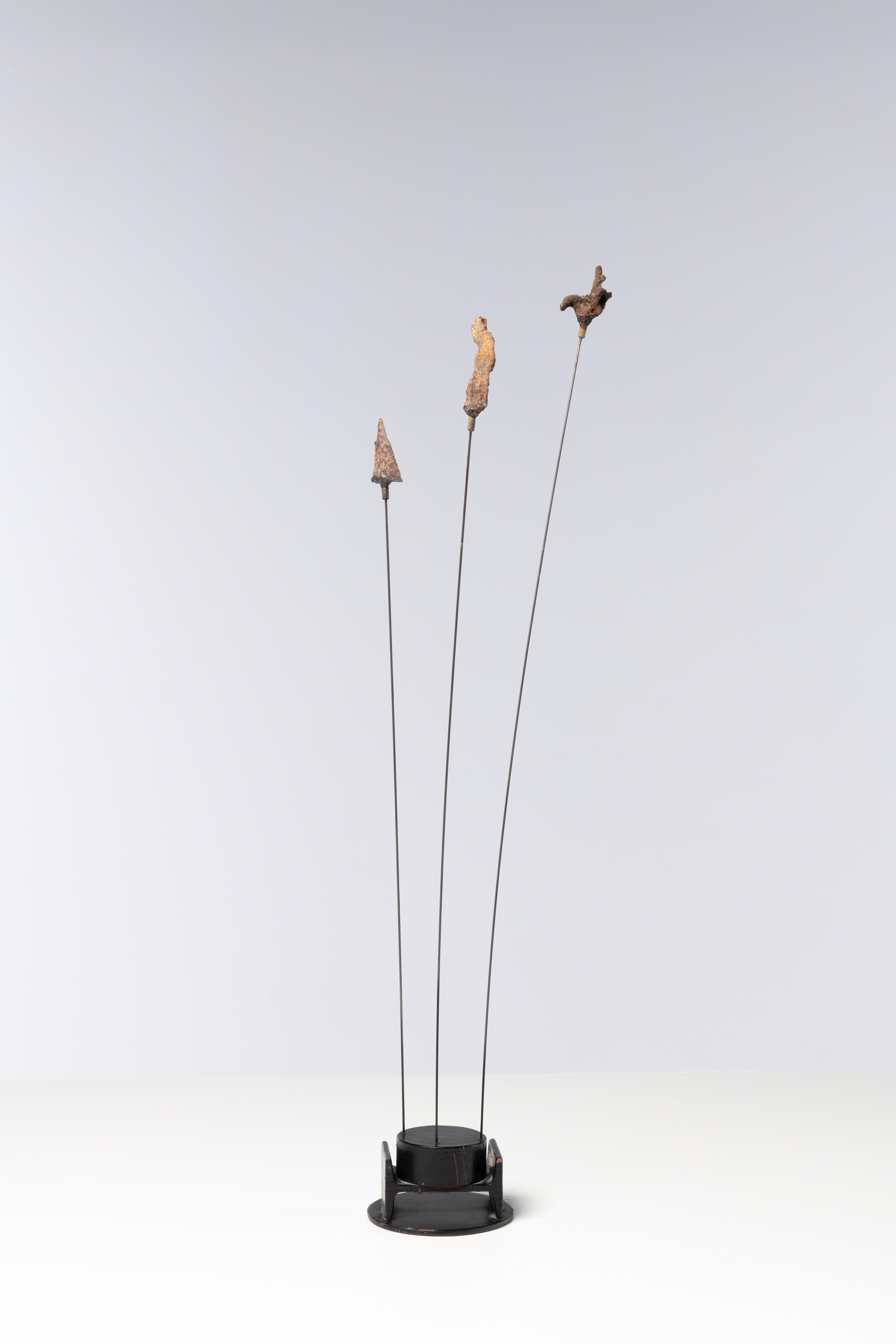 Using artistic techniques related to magnetism, Takis began creating his first signals as early as 1955. He likened the signals, composed of found objects and iron, to flowers.