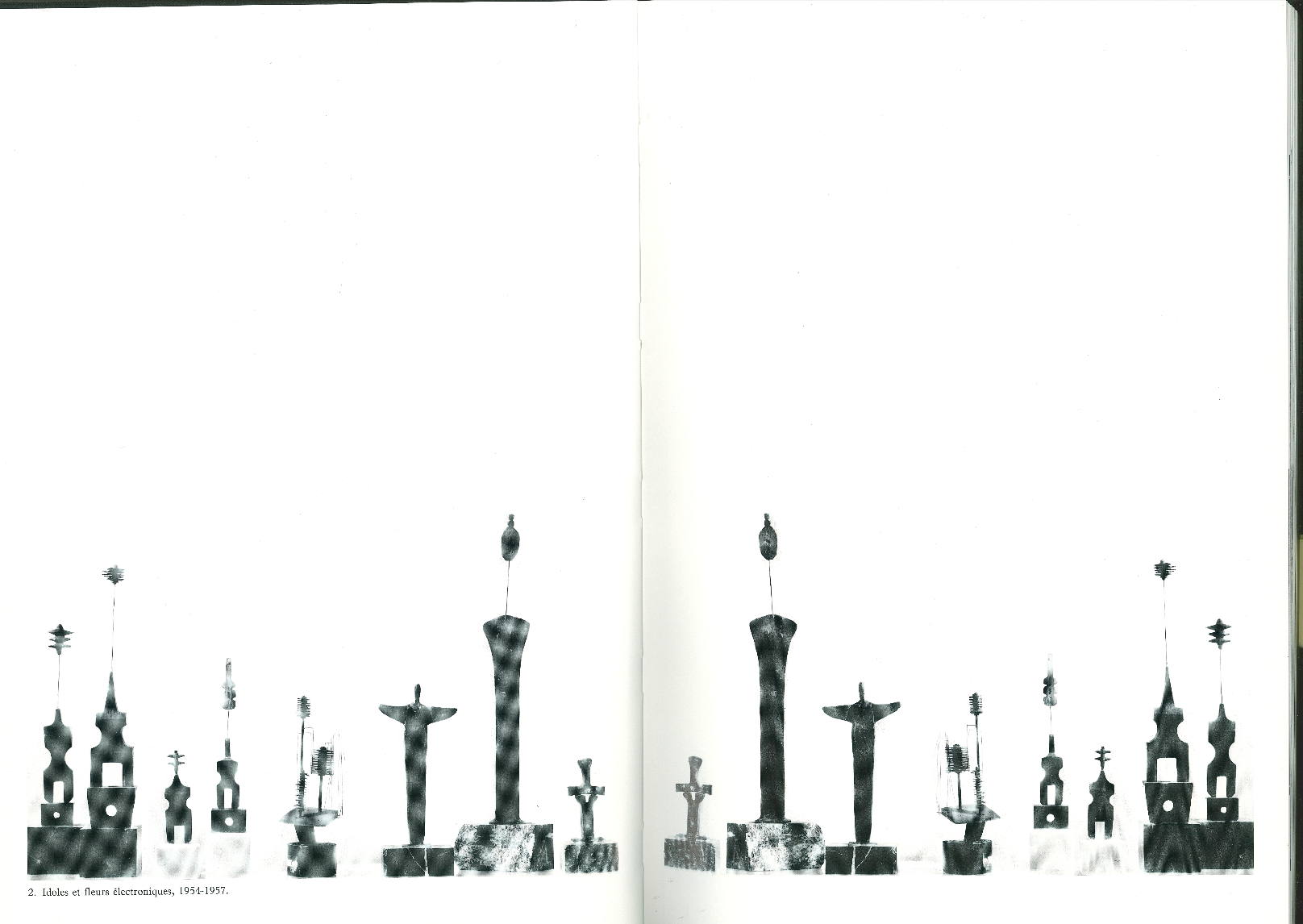 "Takis sees flowers as pollen signals to bees, just as signposts warn of crossroads and bends. The signals of the seventies no longer resemble fragile, disheveled reeds. Elegantly disproportionate, seemingly balanced, the signals laid out in single file on a plain call to mind the plaster soldiers of more than twenty years ago. In a group of three rods, two are coif- fered with electronic parts found at random, the third bears a hand-worked steel "bla- son", a white arrow on a black field. Another triad, whose exceptionally large rods are set "up to their necks" in heavy fluted sleeves, carries parts, one of alumi- nium, the other of steel and a tiny handmade bronze disc pierced with an eye."