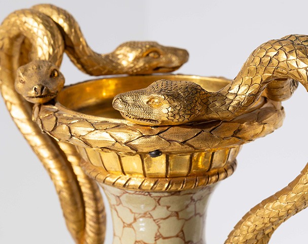 The principle of handles intertwined with two serpents for each handle is a motif that would be repeated on numerous mounts from the Louis XVI period. It likely finds its direct origin in the porphyry or basalt vases produced in Rome in the last third of the 18th century. A nearly identical design can be found on a basalt vase carved in Rome around 1760-1770, now housed at the Château de Versailles (formerly part of the Bailli de Breteuil and Lenoir du Breuil collections).