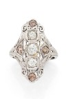 18k white gold (750‰) and platinum (850‰) ring, openwork and engraved in imitation of lace, set with old-cut round white and fancy-color brown diamonds.