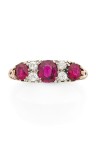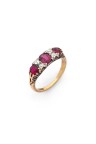 18k yellow gold (750‰) and platinum (850‰) openwork rivière ring with scrollwork decoration, set with three round rubies, the central one being larger, and diamonds.