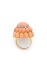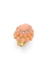 18k yellow gold (750‰) ‘Chandelier’ ring adorned with an oval coral cabochon in a double setting of coral cabochons and small diamonds.