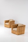 Pair of armchairs Rope, wood and fabric Edited by Audoux-Minnet Manufacturer's plaque on each armchair Model created circa 1948 H 62 × L 66 × W 73 cm Bibliography: Art & Industrie, n°16, 1949, similar models, unpaginated