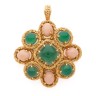 André COL, Paris 1970s Pendant forming polyfoil 18k (750‰) yellow gold brooch, granulated with coral and chrysoprase cabochons Signed, silversmith's hallmark Dimensions: 6,5 x 5,5 cm Gross weight: 45,4 g Original signed case