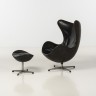 Arne Jacobsen (1902-1971) Egg Fauteuil et repose pied Cuir et acier Edition Fritz Hansen Date de création : 1957 Fauteuil : H 106 × L 86 × P 88 cm Repose-pied : H 43 × L 54 × P 39 cm Bibliographie : - Félix Solaguren-Beascoa, Arne Jacobsen, approach to his complete work,1950-1971, Arkitektens forlag, 2001, p.116-123 - Noritsugu Oda, Danish Chairs, Chonicle books, 1999 p.60 Jean-Michel Homo, La côte du design édition 2006-2007, Price Guide of Design, 2005 p.221