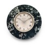 BOUCHERON, Paris. Années 1913-1915. Pendulette de table "chevalet" de forme ronde en agate mousse, le cadran guilloché à décor rayonnant. Chiffres romains pour les heures, le tour de lunette et la monture en vermeil, partiellement émaillés de filets blancs. Les aiguilles serties de diamants taillés en rose. Diamètre : 11,5 cm Poids brut : 305 g