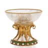 BOUCHERON, Paris. Magnifique coupe en cristal de roche cerclée d'une bordure perlée en or. Elle est supportée par six feuilles d'acanthe nervurées et recourbées, très finement ciselées en or jaune satiné. Piédouche en cristal de roche, monté sur or émaillé vert à décor de feuilles d'eau séparées par des perles fines. Signée et poinçon de MO Années 1967-1968 Hauteur : 6,3 cm. Diamètre : 7,3 cm. Poids brut : 155 g