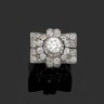 Bague "chevalière" en platine de forme géométrique, sertie de diamants ronds de taille ancienne, celui du centre plus important. Années 1930-1935. Tour de doigt : 55 Poids brut : 18,5 g Poids estimé du diamant cental : 1,30 à 1,50 ct environ.