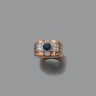 Bague chevalière de dame en or jaune 18K (750‰) et platine (850‰) à godrons ornée d'un cabochon de saphir et de diamants taille ancienne et taillés en rose. Années 1945.