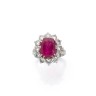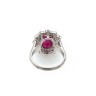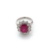 Marguerite ring in platinum (850‰) adorned with a facetted oval ruby weighting 4,5 carats approximately, in a surrounding of 12 round diamonds