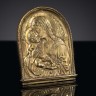 Baiser de Paix en bronze doré de forme cintrée représentant la Vierge à l'Enfant en buste de profi gauche dans une niche à coquille ; poignée au dos. Italie, d'après Donatello, fi du XVe siècle H 10,4 × L 8,9 cm (poignée remplacée anciennement) Cette composition a fait l'objet de nombreuses interprétations en plaquettes et plus rarement en baisers de Paix comme ici. Les historiens d'art se sont accordés à reconnaître dans cette Vierge à l'Enfant étroitement réunis le style de Donatello en établissant une relation avec les Madones qu'il réalisa à la fi des années 20 et au début des années 30 du quattrocento.