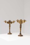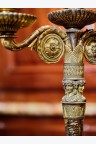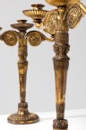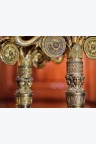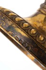 Round gadrooned ogee base with double ducal coat of arms (including, on the right, that of the Comares de Cordova house) and the motto ‘Vincitor in Navas de Tolosa’, referencing a Reconquista battle, in 1212. Four pairs of feet and four Bacchante heads, the top part aligning three horizontal lamps on two symmetrical arms with foliage around a rosette.