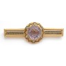 Broche barrette en or jaune 750‰ ciselé ornée de filets d'émail noir, la partie centrale formant une rosace agrémentée d'une améthys...