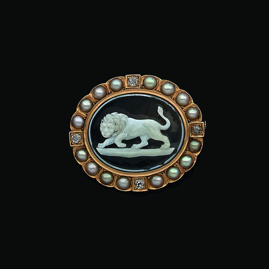 Broche en or jaune 750°/oo de forme ovale, ornée au centre d'un camée agate mousse, figurant un lion, dans un entourage de demi-perles et quatre diamants ronds alternés. (Givres assimilables à des fêles). Travail du XIXe siècle. Longueur : 4 cm Poids brut : 13,8 g