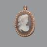 Broche/pendentif ovale en or jaune 18K (750‰) ornée d'un camée sur agate à décor d'une femme de profil à l'antique portant une couronne de lauriers. Entourage de demi-perles. La bélière amovible.